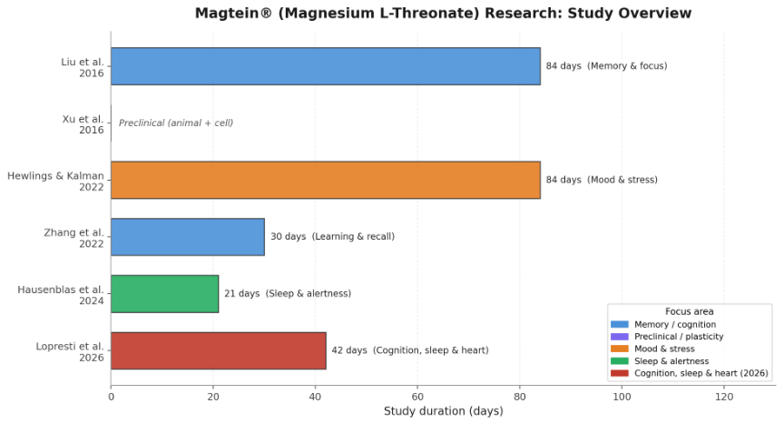 Figure 1. Études sur le Magtein® (L-thréonate de magnésium) par durée et domaine d'étude (2016-2026).